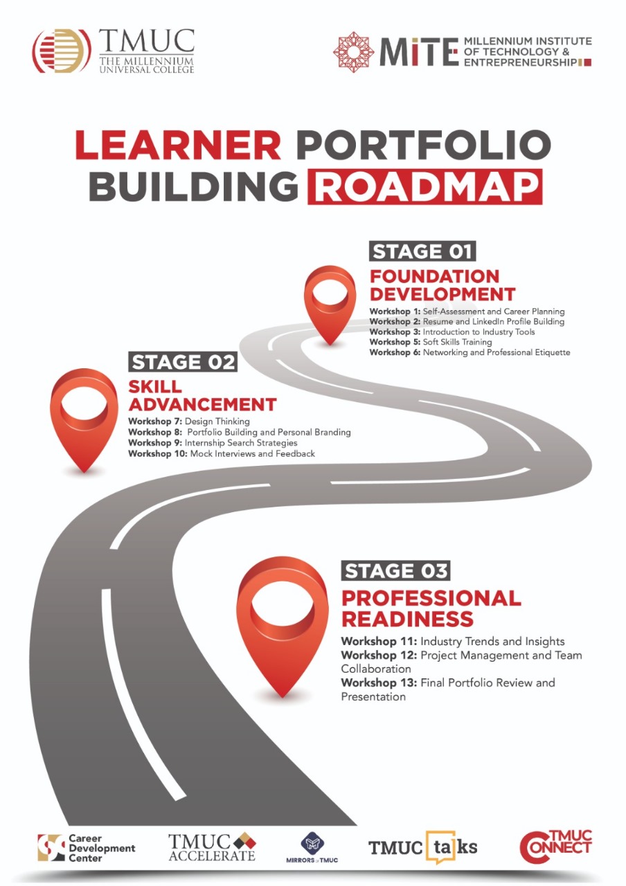 The Career Development Centre (CDC) at TMUC is dedicated to equipping students with the skills, experiences, and tools they need to thrive in the modern workplace. Our Portfolio Building Plan is a structured program designed to help students showcase their competencies and achievements in a professional format. Through workshops, one-on-one career coaching, mock interviews, and CV clinics, students build robust personal portfolios that highlight both academic and extracurricular accomplishments. We guide students in documenting internships, volunteering, leadership roles, and certifications that align with their career aspirations. The CDC also supports LinkedIn optimization, personal branding, and the development of digital portfolios for creative fields. By the time they graduate, TMUC students possess a portfolio that sets them apart in a competitive job market, reflecting their unique value, ambition, and readiness for industry engagement.